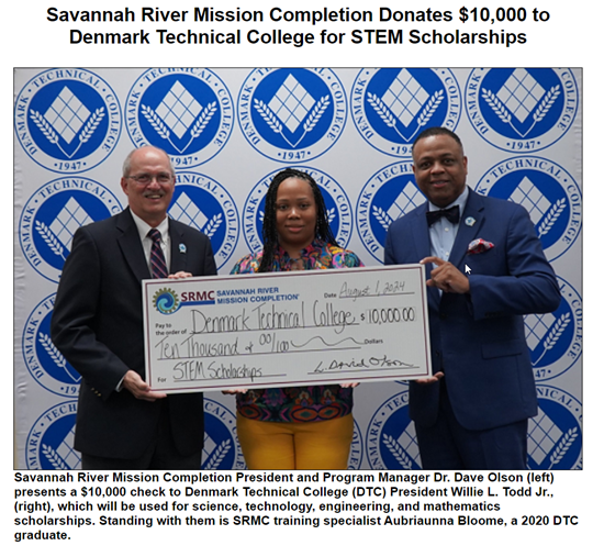 Savannah River Mission Completion Donates $10K to Denmark Technical College for STEM Scholarships